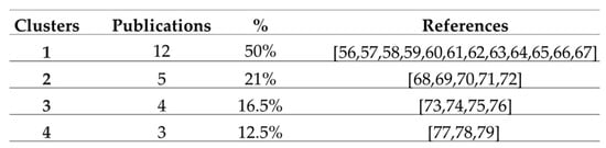 The first cluster is the one with the most weight of the total number of papers analyzed. Fifty percent of the selected papers are related to topics that belong to this cluster [56,57,58,59,60,61,62,63,64,65,66,67] (Figure 9).