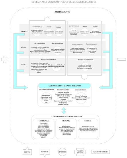 In order to fill the persistent gap within the literature on the influence of sustainable product attributes on SE consumers’ decision-making and behavior [28], this research provides an integrative conceptual framework. This framework, susceptible to being empirically proved in future research, reflects significant relationships between antecedents—in the form of drivers and barriers—at different levels, individual determinants of sustainable customer behavior, and valued product attributes in the eyes of SE customers. In particular, antecedents may influence customers’ sustainable behavior, which in turn, is modeled by individual factors of sociodemographic, psychographic, and sociographic natures. Simultaneously, customers’ sustainable behavior and (valued) product attributes perceived can be mutually conditioned.