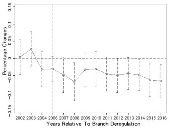 The benchmark regression results are shown in Table 2. First, this paper examines the impact of the MER represented by the target responsibility system of environmental protection on the quantity of green technology innovation. The results in column (1) show that under the bidirectional fixed effect of individual and year, the estimated coefficient of is significantly positive at the level of 1%. Further, Figure 1 shows the dynamic effect of MER on the number of green innovation activities. It can be seen that the estimated coefficient of the three years before the implementation of the target responsibility system of environmental protection, is not significant, which means that the parallel trend assumption of DID estimation is satisfied. After implementation of the target responsibility system of environmental protection, the quantity of green patent applications has increased significantly, indicating that implementing the target responsibility system of environmental protection has increased the quantity of green innovation. Secondly, the impact of the target responsibility system of environmental protection on the quality of green technology innovation is investigated. The results show that the coefficients of are significantly negative, indicating that the implementation of the target responsibility system of environmental protection inhibits the improvement of the quality of green technology innovation. The results in Figure 2 show that the estimated coefficients of the three years before the implementation of the target responsibility system of environmental protection are not significant, meeting the parallel trend assumption, and the quality of green patents has significantly decreased since 2010.