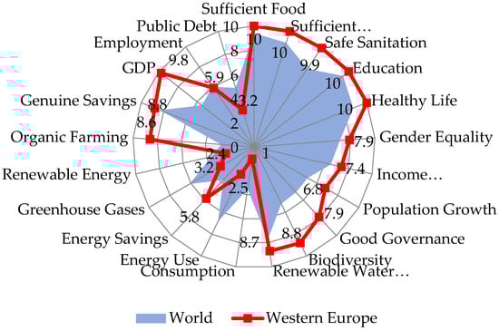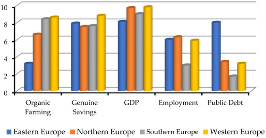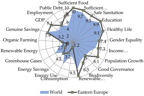 Two indicators from the Transition category register values at the level of Eastern Europe above those of the world average, showing their efficiency from a sustainable point of view. Thus, GDP is placed above the average by 2.6 points and Organic Farming by 0.5 points. Eastern Europe’s employment is six points, which is the same as the world average. The Genuine Savings indicator, with a value of 7.9 points, is 0.4 points below the average, although it is in a favorable situation for sustainability. There is an exception to the Public Debt indicator because although the difference from the average is 2.9 points, it does not indicate a positive state of sustainability at the level of Eastern Europe, through the high value recorded, of 8 points.