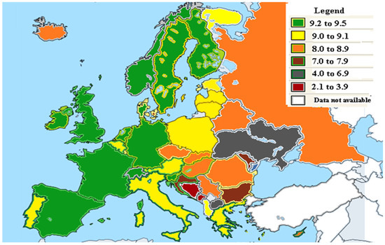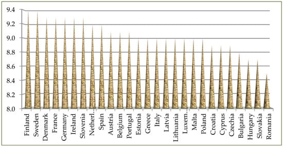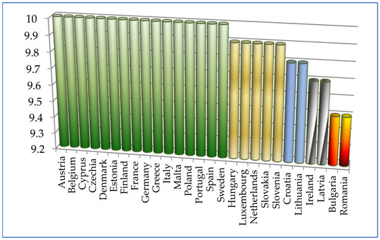 - Sufficient Drinking Water—evaluates the level of use of basic drinking water services and takes values between 1 and 10, where the maximum value indicates that 100% of the population benefits from these services.