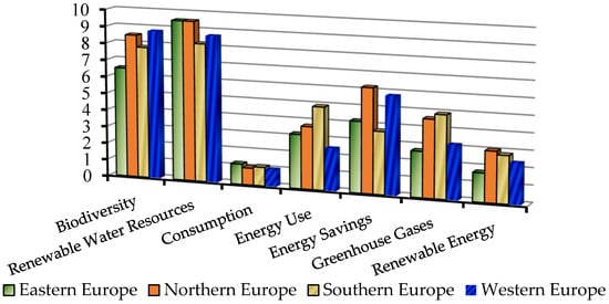 Three indicators of the Environmental Well-being category have values lower than the world average, which reflects unfavorable situations for sustainability. Thus, it can be highlighted that Energy Use is 3.6 points below the world average, Greenhouse Gases by 3.4 points and Renewable Energy by 1.9 points. The value reduced by 2.3 points compared to the world average of the Consumption indicator translates to a favorable situation for Eastern Europe, as well as the 1.2 points being very close to 1, which represents the required zero ecological footprint. At the same time, in this category, there are also positive differences compared to the average, which indicates positions favorable for sustainability. Thus, in addition to the difference of 1.3 points for Biodiversity and 1.8 points for Renewable Water Resources, the difference from the average of 0.5 points for Energy Savings also indicates a favorable sustainable situation through the value of 4.2 points less than the 5.5 established and presented theoretically.