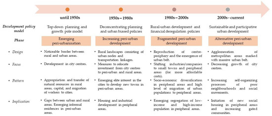 Stages of development of peri-urban areas. Source: Elaborated from Adell, [48]; Coy, Sandholz, Töpfer, & Zirkl, [56]; Douglass, [57]; Firman, [58]; Rauws & De Roo, [3]; Rondinelli, [59].
