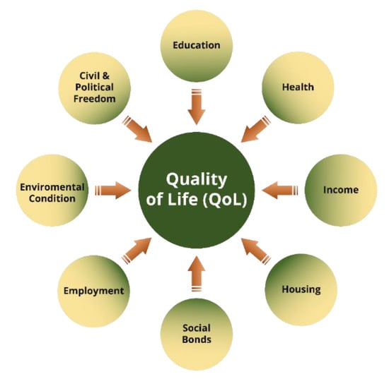 QoL is constructed by a set of components closely related to the standard of living, or each individual’s welfare (see Figure 2 for details). From an economic perspective, the components of QoL consist of income, employment and housing. All these components are generally used to assess welfare [118]. Income and employment are evidence of individuals’ economic productivity, and this productivity can be further utilised to meet other needs. Homeownership not only reflects the social status of an individual [119] but also represents that individual’s level of welfare [120]. Moreover, these days, buying a house is not a simple matter, as prices are rocketing while housing is among an individual’s primary needs. This situation highlights the status of individuals. From another perspective, health and education make up social aspects of QoL. Human resources are needed to enhance economic productivity and individual interaction [121]. Likewise, a social perspective represents a connection between individuals and their neighbourhood or other society members. A higher level of interaction, higher position and more participation of an individual in society will improve their life quality. Thus, social bonds and political freedom should also be considered as QoL components [44]. On the other hand, Keles [111] asserts that QoL is closely connected to the presence of resources required to support economic activities. Good environmental quality is also related to people’s health, which is fundamental in social activities [112].