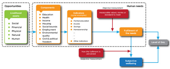 In general terms, QoL can be evaluated through interactions between livelihood assets and human needs (Figure 3). Livelihood assets, also known as opportunities [44], include natural, social, financial, human and physical capital. Each represents environmental and natural resources conditions, relationships and interactions between people, financial resources, human resources and infrastructure. These assets are a central element in meeting the needs of both individuals and groups. Notably, each of the eight-component assets of QoL represents a focal set of human needs. These eight defined components can be turned into several indicators (See Table 1) to be used as the basic standard to assess the fulfilment of human needs and satisfaction, representing objective and subjective measurements [124], also known as objective and subjective QoL in much of the literature [120,125,126]. The former is carried out based on norms or standards in measuring individual needs’ fulfilment [126,127]. These norms or standards can refer to regulation, government policy or certain studies’ results. On the contrary, a subjective QoL relies on individual perceptions and opinions [128,129]. This approach provides freedom for individuals to assess their satisfaction regarding their needs in life. Although they can provide more information about individual conditions [130], in some cases the different responses given by each individual make it difficult for researchers to draw conclusions [131]. Therefore, the combination of objective and subjective measurements helps to more reliably describe the level of QoL.