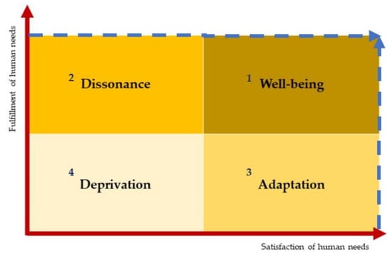 The highest level exists when an individual or group lives in optimal conditions to fulfil and satisfy their human needs. Deprivation, on the other hand, occurs when the individual or a group is in the worst condition and fulfilment and satisfaction of their human needs are at the lowest level [135]. Adaptation and dissonance are considered ‘middle’ conditions [130,135], but dissonance is deemed as ranking above adaptation because it is qualified to fulfil needs according to the minimum standard of living, although with a low level of satisfaction. This is also known as the dissatisfaction dilemma [130]. Considering the adaptation, those who are at this level must try to accept and be satisfied with how their needs are fulfilled, even though this is not followed by the standard of a fulfilling life. Therefore, the level of adaptation is considered pre-prosperous, as is deprivation.