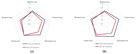 Large-scale development such as new towns in peri-urban areas obviously has an influence on the socio-economic conditions of the locals that have long resided in these areas. These consequences are reflected in their livelihood assets in different dimensions (i.e., social, financial, physical, natural and human). This phenomenon is also encountered by 150 locals in MTB and KBP. Figure 6 shows that prior to the development, average livelihood assets were similar, accounting for a score over 3.0. This number indicates that locals’ average livelihood assets were deemed to be good. The average value of physical assets of the locals was still deemed to be the lowest in both MTB and KBP, accounting for 2.78 and 3.34, respectively.
