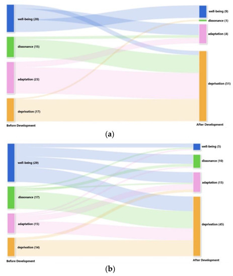 After the development, more than 62% of respondents in MTB and KBP experienced decreases in overall QoL level, most dropping to the deprivation level. In KBP, the most frequent decreases were at the well-being (36%) and dissonance levels (82%), whereas in MTB, the lowest QoL level was present for 80% of respondents who were originally at the dissonance level and 85% of respondents at the adaptation level (Figure 8). All evidence also underlines that adaptation and deprivation dominate the overall QoL level in both research locations due to the development.