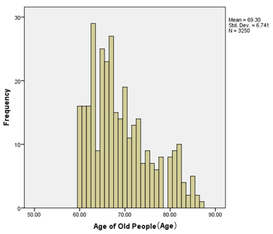 For the personal attributes regarding the travel characteristics of the elderly, six variables (spouse, gender, age, older singletons, driver licenses or monthly pass) were included. People over 60 were defined as the elderly. The age structure of the elderly from the 3250 samples is shown in Figure 1. The age of the main constituent population in the samples ranged between 65–69 years, accounting for 32% of all. People aged between 60–64 and 70–74 took up 26.5% and 19.7%, respectively. The proportion of people aged between 75–79 and 80–84 was almost the same (ca. 10%). The people over 85 years old only accounted for 2.5%.
