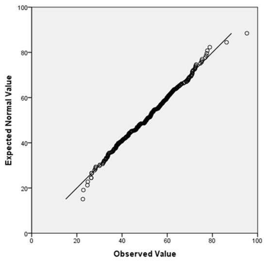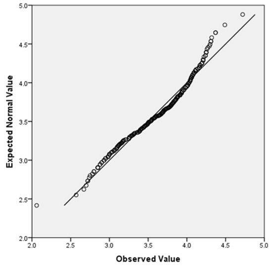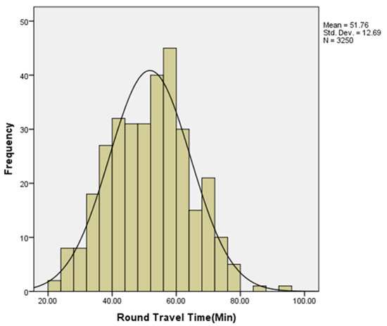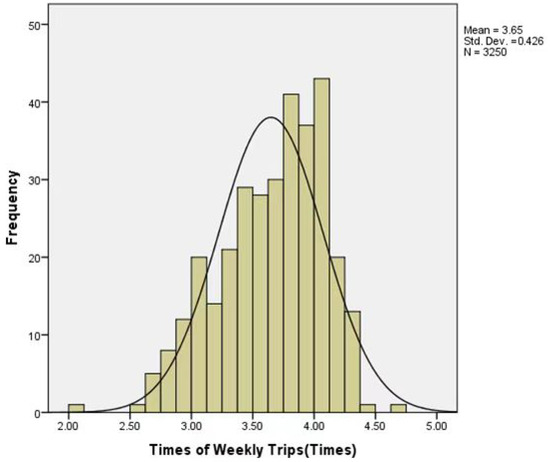 As shown in Figure 2 and Figure 3, the round-trip travel time of the elderly followed a normal distribution, with an average time of 51.76 min. As seen from the Figure 2 and Figure 3, the whole sample fluctuated near the trend line of normal distribution except for some samples of 20 min and some of more than 80 min. Similarly, the number of trips per week followed lognormal distribution or normal distribution as shown in Figure 4 and Figure 5. The average time of the samples was 3.65, indicating the surveyed elderly traveled 3.65 times a week on average.