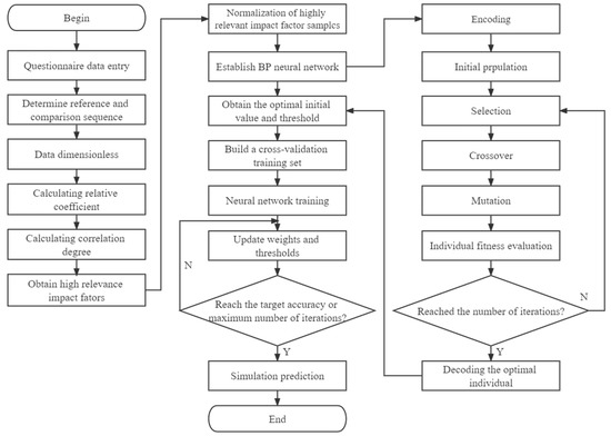 In general, model fusion more or less improves the final predictive power and is generally no worse than the optimal submodule. The basic theoretical assumption is that different submodules behave differently on different data and that we can combine their strengths to obtain a model that is “accurate” in all respects. Although it is unrealistic to assume that the errors of the submodules are independent of each other, an appropriate combination of methods could still be used to improve the results by exploiting the strengths of each submodule. In this paper, the GR-GA-BP hybrid model was adopted to predict the travel behavior of the elderly. The model consists of three parts, including the grey correlation degree (GR) module for data analysis, the genetic algorithm (GA) module for the optimal selection of the initial and threshold values, and the back propagation (BP) neural network module for travel behavior prediction. Detailed descriptions for each part of the model could be found in the subsequent sections. The overall framework of the model is shown in Figure 6.
