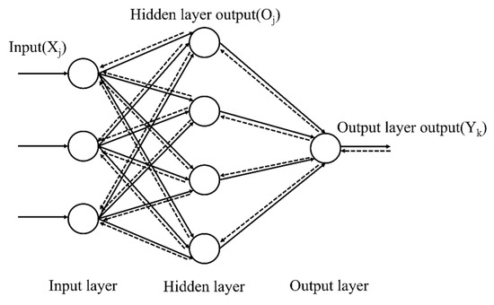 Mean square error (MSE) was used as a cost function in error backpropagation. Through the error signal, the error was transferred from the output layer to the input layer, and the weight was updated by the steepest gradient descent method (Equations (9)–(11)).