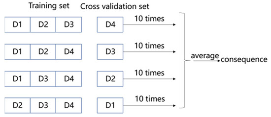 The samples with data sets were divided into a training set, a cross-validation set, and a test set (shown in Figure 8). First, the set of training and cross-validation was discussed and divided into n groups according to the number of equal data bars. One group of data was taken out from each group of experiments as the cross-validation set for experiments, and the remaining group was the training set. A total of groups of experiments were carried out. Each group of experiments took the average value of K times, which was called K times and n-fold cross-validation.