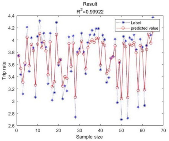 The input vector was the influencing factor of the times of weekly trips, and the output value was the corresponding times of weekly trips. Through cross-validation and grid search, the optimal parameters for the GR-GA-BP model were determined as shown in Table 4. By comparing with the corresponding training error results of all five types of models, the generalization ability of the proposed model is shown in Table 5. The predicted and observed values in the test set are shown in Figure 9. The variation in squared error and evolution times in the training set is shown in Figure 10.