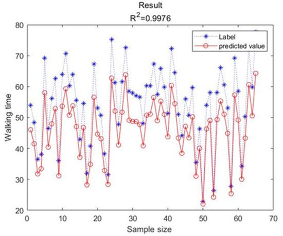To predict the round-trip travel time of the elderly, the input vector was chosen as the influencing factor of the round-trip travel time, and the output value was the corresponding round-trip travel time. The optimal parameters of the GR-GA-BP model were determined through cross-validation and grid search as shown in Table 6. The training errors of the five types of models are shown in Table 7. The generalization ability of the proposed model was determined. The goodness of fit between the predicted and the observed values in the test set is shown in Figure 11. The variation in squared error and evolution times on the training set is shown in Figure 12.
