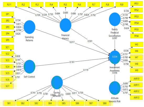 The descriptive statistics values are illustrated in Table 2. The minimum and maximum values for all variables are 1 and 5, respectively. The mean score for investment awareness is 3.85, with the lowest standard deviation of 0.703. In general, the results showed that the level of investment awareness among the students of the School of Business and Applied College at King Faisal University is at a reasonable level. This is in accordance with Sabri et al. [31], who stated that school life represents the first time of financial independence for students without their family supervision. Whereas the maximum mean value was reported to be 3.69 for family financial socialization, the reported minimum mean was 2.61 for self-control. The results specified an agreement among the study’s respondents concerning the significance of family financial socialization in enhancing students’ investment awareness. In the same way, the standard deviations of the responses were reported to be between 0.703 and 1.062.