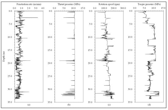 Specifically, Figure 1a shows the changes in the penetration rate with the drill hole depth. Figure 1b–d shows the changes in thrust pressure, rotation speed, and torque pressure along the drill hole depth, respectively. The MWD data analysis software generally calculates the penetration rate from the time divided by preselecting the depth advance increment. The penetration rate, , obtained from MWD technique is calculated by Equation (1) [33]: