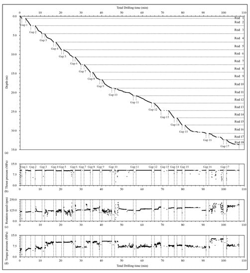 From Figure 2a, it can be observed that the advancement of the drill bit depth with the drilling time has seventeen disconnected horizontal segments or gaps (). They could be the depths where adding of a new drill rod took place. The depth intervals between any two adjacent gaps are about 2 m, which is consistent with the constant length of the drill rods. This result demonstrates that the operators added eighteen drill rods (each one 2 m long, added one by one) to form this drill hole.