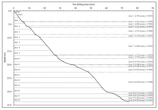 After having eliminated the auxiliary operation time () associated with the MWD data, the advancement of the drill bit depth with the pure or net drilling time can be plotted (Figure 3). It can be clearly observed from Figure 3 that the curve of the drill bit depth with the net drilling time consists of many linear segments. Each linear segment has one almost constant gradient or slope. This slope can represent the constant penetration rate of a homogeneous geomaterial zone [22,23,24,25,26,27,28]. For each linear segment in the curve, the constant gradient or penetration rate can be calculated using least squares regression analysis with Equations (4) and (5) [22]: