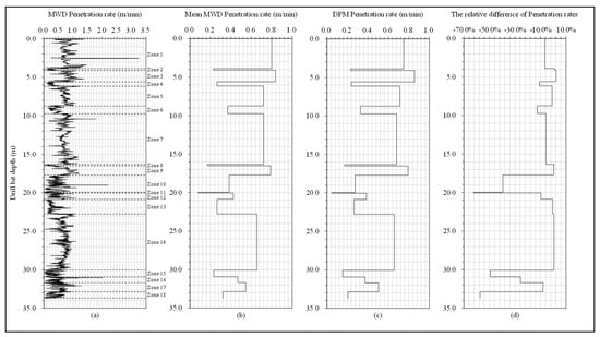 Figure 4 and Table 1 compare the MWD penetration rate and the DPM penetration rate. Figure 4a shows that the MWD penetration rate has strong random variations with depth. Figure 4c shows that the DPM penetration rate has step function-shaped variations, i.e., piece-wise constant penetration rates with depth. Such a piece-wise constant penetration rate with depth is consistent with the fact of piece-wise homogeneity of geomaterials in the ground. Figure 4b shows the mean MWD penetration rate for each of the eighteen linear zones along the depth, which can differ from that of the DPM penetration rate for that zone. Figure 4d shows their percentage differences using Equation (6).