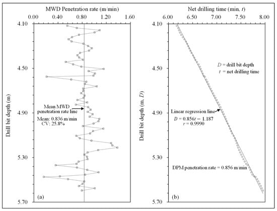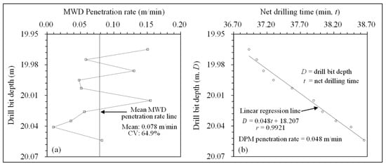 Figure 6a shows the MWD method and Figure 6b shows the DPM method for zone 11 (with −62.5% difference). The mean MWD penetration rate for zone 11 is 0.078 m/min, with a coefficient of variation of 64.9%. The DPM penetration rate is 0.048 m/min, with a coefficient of linear correlation of 0.9921. The level of random variation in the MWD penetration rate is high, and the DPM penetration rate is constant. Hence, the absolute relative difference of penetration rates is large (with 62.5% absolute % difference).