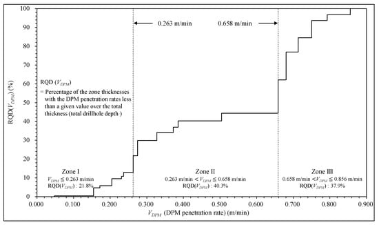 In Figure 7, values of DPM penetration rate versus the percentage of DPM thickness with the penetration rate less than a given value are plotted. The vertical axis in Figure 7 stands for the RQD(VDPM) with the DPM penetration rate equal to or less than a given DPM penetration rate along the horizontal axis. Based on its variation pattern, the curve can be divided into the following three strength zones as the DPM penetration rate increases along the horizontal axis. Zone I, with a DPM penetration rate between 0 m/min and 0.263 m/min, is defined as a low DPM penetration rate. Zone II, with a DPM penetration rate between 0.263 m/min and 0.658 m/min, is defined as a medium DPM penetration rate. Zone III, with a DPM penetration rate between 0.658 m/min and 0.856 m/min, is defined as a high DPM penetration rate.
