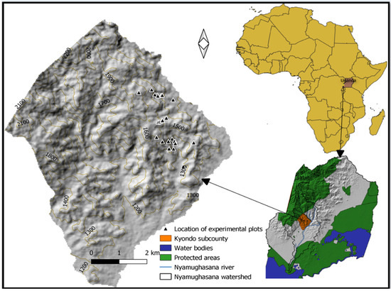 The study was conducted in the Rwenzori Mountains, at the border between Uganda and the Democratic Republic of Congo. The Rwenzori Mountains experience a tropical climate with bimodal rainfall (March-May: 286 mm, 23.3 °C and August–November: 375 mm, 22.9 °C), and average annual rainfall of 884 mm [36]. The soils in this area are erosion-prone Leptosols, which are predominantly loamy sand [36,37]. In this area, the main cultivated crop is C. arabica grown as a mono-crop, under which approximately 60% of the land is prone to erosion due to steep slopes [37,38,39]. Soil erosion is also high, due to population pressure and degrading farming practices [16,38]. The population explosion in this region has also been associated with other environmental disasters, some of which co-occur with soil erosion, such as landslides. For a detailed description of the Rwenzori, regarding landslides and erosion, as well as related disasters, reference is made to the several disaster-related studies that have been conducted in the Rwenzori [40,41,42,43]. Within the Rwenzori Mountains, the study was conducted among smallholder farmers in Kyondo sub-county, located in Kasese district at 0°11′12.0″N, 30°05′17.0”E (Latitude: 0.186667; Longitude: 30.088050) at altitude 1300–1800 m above sea level (Figure 1).