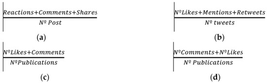 Social networks’ formulas. (a) Facebook engagement formula, (b) Twitter engagement formula, (c) Instagram engagement formula, and (d) YouTube engagement formula.
