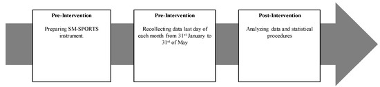 An observational analysis of the content of the selected social networks in the different sports clubs of the Endesa ACB League was carried out. The data collection was carried out in the period from 4 January to 14 May 2022 (match days 16 to 34) to deeply examine if the ranking position has an influence on the social media engagement of the above-mentioned basketball clubs during a long period, rather than just one month. The second half of the year was selected as the study period because the social networks show more activity, as teams are playing the last league qualification matches and this creates more interaction on social networks. In addition, it is considered that in the second half of the year, the teams are already more realistically positioned in the ranking according to their level of play due to all the matches already played (unlike in the first half of the year). Firstly, each of the clubs’ websites was visited to identify the social networks they used. Then, the social networks of the basketball clubs were entered into the Rival IQ [28] tool to obtain the necessary data on the interactions of each social network, and to calculate the engagement in the MS-SPORTS log sheet. This data collection was carried out on the last day of each month (see Figure 2).
