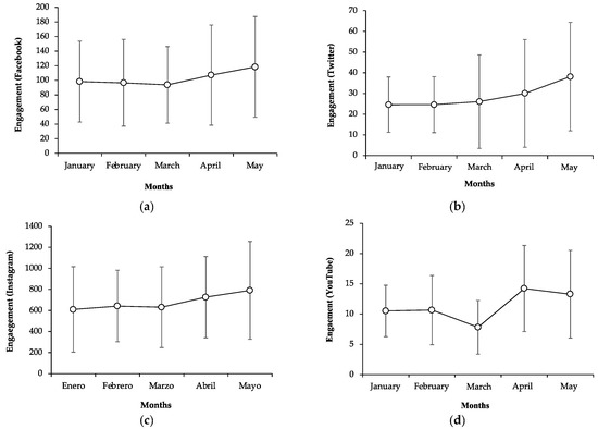 Social networks’ engagement. (a) Facebook engagement, (b) Twitter engagement, (c) Instagram engagement, and (d) YouTube engagement.