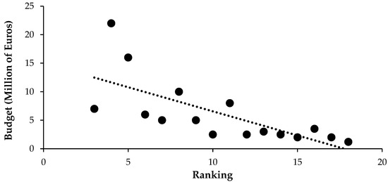 Posteriorly, a correlation analysis was performed between the engagement mean of each network (Facebook, Twitter, Instagram, and YouTube) and budget and ranking. Crucially, no correlations were found between any variables. However, a new correlation analysis between ranking and budget revealed large significant effects (r = −0.71 and p = 0.001) (see Figure 4 for more information).