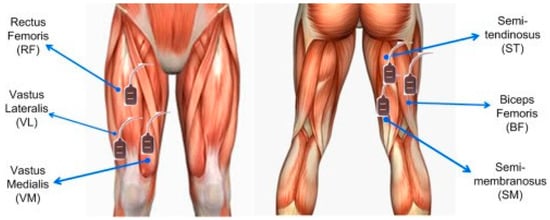 Long-term monitoring with surface electrodes is simpler than with iEMG needles. As Kanoga et al. have shown, the location of the sEMG sensors has a considerable impact on the collected signal and its subsequent analysis and identification using the calculation method [16]. sEMG sensors can collect data during daily human activities, such as sitting, climbing, walking, and standing, which can then be used to recognize actions, detect anomalies, etc. The goniometer was connected out of the knee joint, and sEMG data were collected for four muscles: rectus femoris (RF), biceps femoris (BF), vastus medialis (VM), semitendinosus (ST), and semimembranosus (SM) (Figure 1).