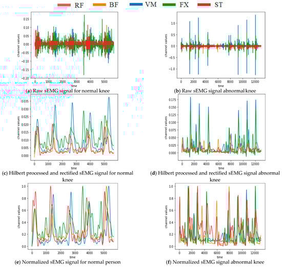 Table 4 and Figure 2 show the statistical analysis of all the datasets. The standard deviation of FX is the highest, and BF is the lowest in all the datasets. EMG signal plots can be seen before data preprocessing in Figure 2a for the four channels of a normal person and in Figure 2b for an abnormal person. EMG signal plots can be seen after signal preprocessing, in which we rectify and transform the filtered sEMG values we can see in Figure 2c for a normal person and in Figure 2d for an abnormal person. After normalizing, we achieve the plots as shown in Figure 2e for a normal person and in Figure 2f for an abnormal person.
