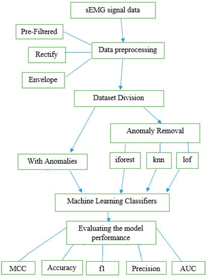 This work demonstrated machine learning for movement classification using sEMG data. The suggested models are based on a large database with various parameters. This study aimed to analyze differences in classification performance following anomalous detection methods. It was used to identify events in EMG signals that differed significantly from most data and to create new data sets.