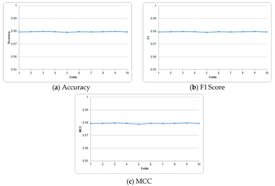 The MCC is calculated using Equation (2). Figure 4c shows the average MCC of all the models after 10-fold validation. The light gradient boosting machine has the highest accuracy of 0.985, followed by xgboost and random forest. Extra trees have the lowest accuracy of 0.367.