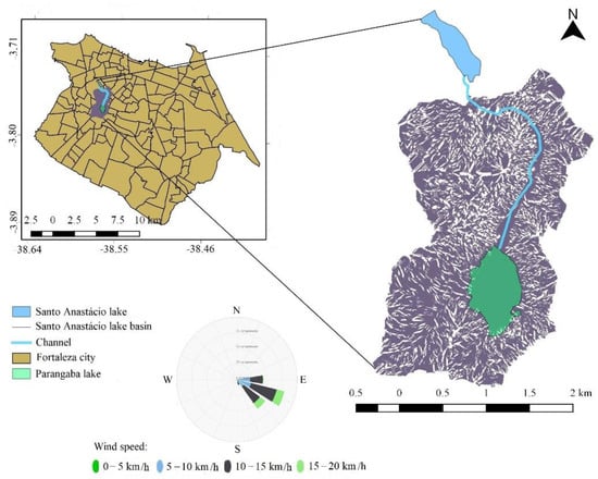 Contribution basin of the Santo Anastácio Lake inlet section in Fortaleza, Ceará, Brazil. Shapefile source (Fortaleza): Fortaleza (2020) and wind rose for a typical day: www.meteoblue.com (accessed on 3 September 2022). Datum: SIRGAS 2000, Zone: 24 S.