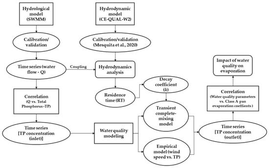 The collection of water samples was performed concomitantly with the measurements of the inflow and outflow of the lake. A van Dorn bottle was used for this purpose. The parameters analyzed were total phosphorus (TP) in 2013, 2014, 2018, and 2019 and BOD in 2013. TP analyzes were conducted in the Chemical Analysis Laboratory (LAQUIM), while BOD was analyzed at the Environmental Sanitation Laboratory (LABOSAN), both at the Federal University of Ceará (UFC). Water quality analyzes were performed according to Standards Methods [31]. The study framework is summarized in Figure 2.