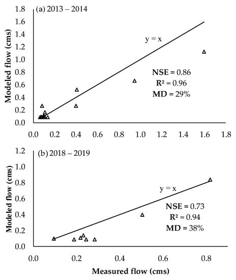 Figure 4a presents the result of the calibration using the flow data measured and modeled by SWMM in 2013 and 2014. Through the calibration of the model parameters, an NSE coefficient of 0.86 was obtained, an R2 coefficient of 0.96, and a mean deviation of 29%. Figure 4b presents the result of the SWMM validation process, with data from 2018 and 2019, for the same statistical variables, resulting in an NSE coefficient of 0.73, an R2 coefficient of 0.94, and an average deviation of 38%. Previous surveys performed with SWMM obtained similar NSE values: 0.616–0.899, in Orissa, India [11]; 0.71–0.75, in Lille, France [12]; 0.76–0.78, in Helsinki, Finland [38]; and 0.93, in Fortaleza, Brazil [2]. Regarding the mean deviation, the values obtained here were within the range reported in the literature of 7–54% [2].
