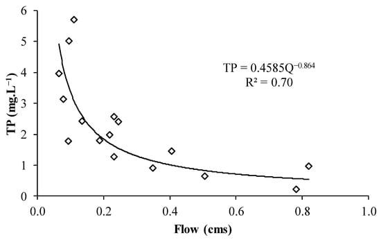 Figure 6 shows the correlation between the inflow to Santo Anastácio Lake and the phosphorus concentration at the inlet. It is verified that the fitted function was a power law, with an R2 of 0.70; therefore, statistically significant. It is noteworthy that this correlation was used, as mentioned, to generate the time series of concentration of phosphorus inflowing to Lake Santo Anastácio in 2013, 2018, and 2019. It is observed that the higher the flow, the lower tends to be the phosphorus concentration; however, tending to stabilize at approximately 0.8 mg/L. This fact could be attributed to the process of dilution of the pollutants carried, mainly phosphorus, the greater the surface runoff generated in the rainiest months. However, in the dry season, with lower flows, high concentrations are maintained due to contributions from sanitary sewage and/or solid waste discharged into the influent channel [4]. It is important to mention that the concentrations of total phosphorus in raw sewage are normally in the range between 5 and 25 mg·L−1 [40].