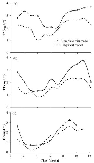 Figure 7a,b shows the phosphorus concentrations calculated at the Santo Anastácio Lake outlet, using the complete-mix transient water quality model [24,35] and the empirical model [10], based on wind speed, in (a) 2013, (b) 2018, and (c) 2019. It is verified that the TP concentration values generated with the complete-mix model tend to be higher than those of the empirical model in all the years analyzed. On the other hand, a similar trend can be observed between the models, despite the differences between the physical principles of the models. Therefore, both models point to the representativeness of lake water quality patterns.