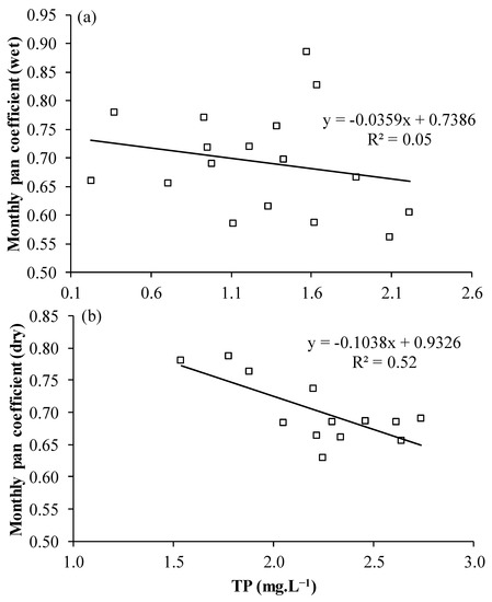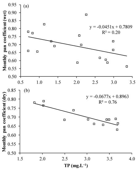 Linear regression between the monthly mean concentration of total phosphorus (TP) (mg·L−1), generated by the proposed empirical model, and the monthly Class A pan coefficient for the (a) rainy season and (b) the dry season of 2013, 2018, and 2019.