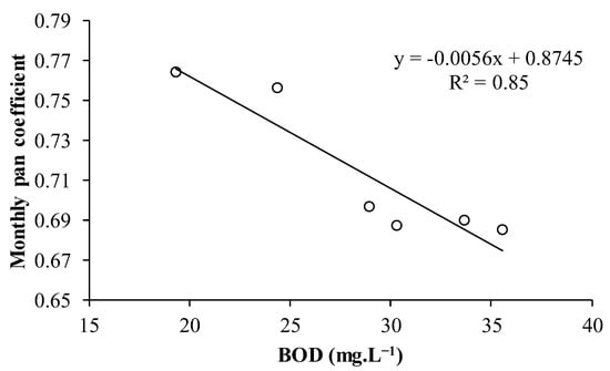 Figure 10 shows the correlation between the BOD and the monthly Class A pan coefficients. As shown, the linear regression showed a negative trend, with an R2 of 0.85, therefore, statistically significant. Thus, the trends observed using TP are confirmed. It is known that BOD is an indicator of the presence of organic matter in water [40]. In this case, high BOD values can also come from organic loads from sanitary sewage and/or solid waste [4].