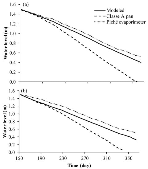 Simulation of the reduction in the average level of Santo Anastácio Lake, in the dry season, considering the zero inflow and different evaporation values, for the years (a) 2013 and (b) 2018.