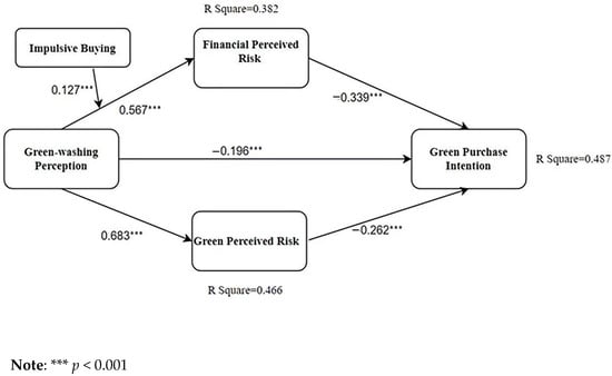 For the 433 valid questionnaires collected, this paper conducts the reliability and validity analysis of the data. Cronbach’s alpha coefficient and composite reliability coefficient are used to analyze the reliability of the questionnaire. Table 3 shows the results of the Cronbach’s alpha coefficient of the model by dimension, and the Cronbach’s alpha coefficients of greenwashing perception, financial perceived risk, green perceived risk, green purchase intention, and impulsive buying are 0.782, 0.777, 0.775, 0.804, and 0.915, indicating that the reliability of the questionnaire is acceptable. Convergent validity was assessed using the factor loading method. Factor loadings of 0.6 or more indicate reasonable convergent validity []. As shown in Table 4, factor loadings for all latent variables are above 0.6, indicating good convergent validity of the factors. Average variance extraction (AVE) is used to assess the discriminant validity of the measure []. Specifically, the square root of AVE must exceed the correlation between the variable and other variables. As shown in Table 3, the square root of the AVE of all variables is higher than the correlation between all constructs in Table 3, indicating that the discriminant validity of this measure is accepted. Furthermore, the AVEs of greenwashing perception, financial perceived risk, green perceived risk, green purchase intention, and impulsive buying are 0.534, 0.531, 0.599, 0.630, and 0.746, respectively. All of the AVEs are higher than the minimum level of 0.5, indicating that the convergent validity of this measure is also acceptable. Moreover, the questions in the scale are all from other classical literature that had been tested to ensure content validity.