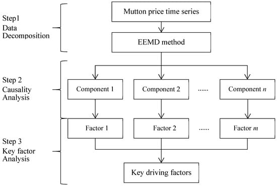 As shown in Figure 1, in order to find the key driving factors of mutton price fluctuation, this paper mainly uses a combination of the data decomposition method and correlation analysis to explain the volatility of mutton price. This framework is divided into three main steps, as shown below.