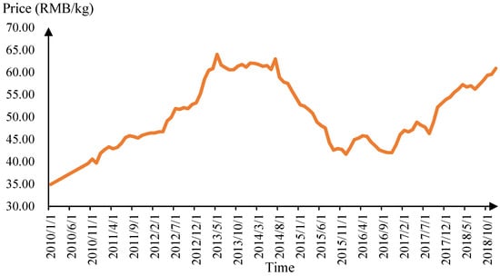 In regards to the internal influencing factors, the feeding and breeding costs caused by feed price, as the internal factors affecting the fluctuation of mutton price, have a certain impact on the fluctuation of mutton price. Scholars have undertaken considerable research from the perspective of feeding and breeding costs. In terms of feeding cost, Shi and Li [1] analyzed the fluctuation of mutton price in China from January 2006 to November 2010. Their research results show that the change in feeding mode and the increase in feeding cost, caused by the rise in agricultural and sideline product prices, are the main reasons for the rapid growth of mutton price. In terms of breeding costs, for example, Zhao [2] believed that the significant increase in mutton sheep breeding costs and the shortage of the mutton sheep breeding labor force are the main reasons for the rapid rise of mutton prices. Yu and Li [3] thought that the mutton price in China was mainly affected by some typical factors, such as the mutton price in the previous period and the production cost in the current period. Furthermore, the influence of different factors on the price of mutton was verified by using a multiple linear regression model. For example, Hao and Qian [4] believed that the general rise in prices and the continuous increase in production costs have played a key role in promoting the rise of mutton prices in China. In addition, Yu and Li [5] and Yang et al. [6] analyzed the influencing factors of mutton price fluctuation in Xinjiang. Their studies show that stock, feeding cost and demand are the main factors affecting mutton price in Xinjiang. Long and Liu [7] constructed a vector autoregressive (VAR) model based on Xinjiang mutton price, feed price, beef price, consumer price index and world mutton price, and analyzed the impact of different influencing factors on Xinjiang mutton price fluctuation by using the impulse response and empirical model decomposition (EMD) methods. Zhao et al. [8] found the decisive factors affecting the rise of mutton price in Xinjiang through econometric analysis. The results show that insufficient supply and high breeding costs are the leading factors affecting mutton price in Xinjiang. Similarly, Zhu et al. [9] pointed out that production cost is the key factor affecting the price fluctuation of mutton in Xinjiang.