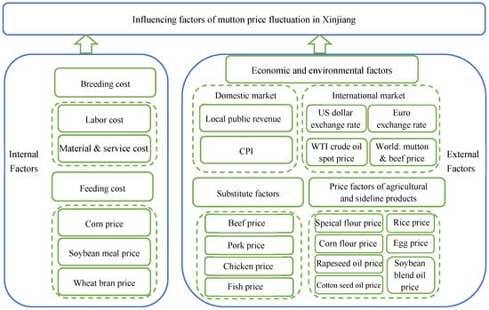 For external factors, many scholars have carried out some investigations on the reasons or influencing factors of the continuous rise of mutton prices. According to the different characteristics of influencing factors, the existing studies divide the main factors of mutton price fluctuation into traditional factors and non-traditional factors. Traditional factors mainly include changes in supply and demand, market factors and the external impact on substitute prices [10]. For example, Yu and Li [3] believed that the price of mutton in China is mainly affected by the price of mutton in the previous period, the production cost in the current period, the output of mutton in the previous period, the population growth rate and the inflation rate in the previous period. Sun et al. [11] found that the reduction in output, the increase in demand and increased cost were the main direct factors for the continuous rise of mutton price. The main medium level indirect factors were low comparative benefit, extensive feeding management, low reproduction rate, high disease (death) rate, reduced stock, low slaughter rate and light carcass. The insufficient policy support, the low scale effect, the incomplete industrial chain, the imperfect breeding and extension system of improved varieties and the imperfect epidemic prevention and control system are the main deep-seated causes. Fan and Fu [12] found that the stock of mutton sheep, the carcass quality level of mutton sheep and the market price of mutton significantly affect the supply of the domestic mutton market. Ding and Xiao [13] revealed that the number of sheep and carcass weight have a significant impact on China’s mutton production, and the income level and mutton price have a significant impact on per capita mutton consumption. The continuous increase of mutton production and per capita mutton consumption will lead to the continuous rise of mutton price. Shen [14] found that the living standard, income level and population of urban and rural residents in the consumer market are the main factors affecting the fluctuation of mutton price. Therefore, the external traditional factors affecting the fluctuation of mutton price include mutton supply, mutton demand, the price of agricultural and sideline products, the price of substitutes and the number of people.