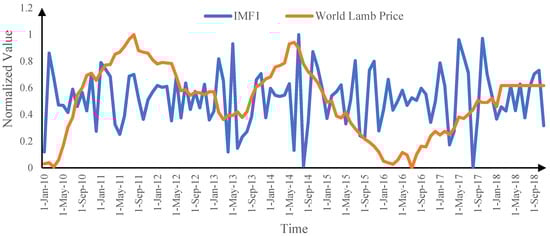 As can be seen from Figure 5, IMF1 has a relatively similar fluctuation trend as the world mutton price on the whole. Since IMF1 is a high-frequency component of mutton price, the fluctuation frequency of IMF1 is large. Even if the fluctuation frequency of IMF1 is large and the fluctuation frequency of world mutton price is small, the overall fluctuation trend of IMF1 and mutton price was found to be the same from the analysis of their peak and valley changes. Therefore, it can be seen from the trend chart of IMF1 and world mutton price that the world mutton price has a positive impact on mutton price in the Xinjiang region of China.