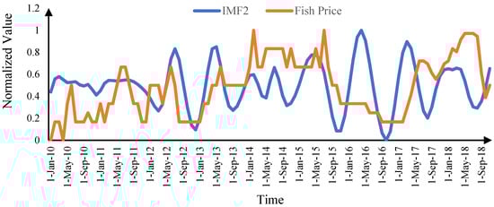 From Figure 6, IMF2 and fish prices generally have an opposite fluctuation trend. From the analysis of the peak and valley changes of the two variables, it was found that the overall fluctuation trend of the two variables always lags by two–four months. In addition, Figure 3 shows that IMF2 has an opposite trend relative to fish price fluctuation on the whole. Therefore, from the trend chart of IMF2 and fish price, fish price negatively affects mutton price in the Xinjiang region of China.