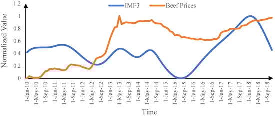 As can be seen from Figure 7, IMF3 and beef prices generally have a relatively similar fluctuation trend. From the analysis of the peak and valley changes of the two variables, it was found that the overall fluctuation trend of the two variables was consistent. Therefore, from the trend chart of IMF3 and beef price, beef price of substitutes had a positive impact on mutton price in the Xinjiang region of China.